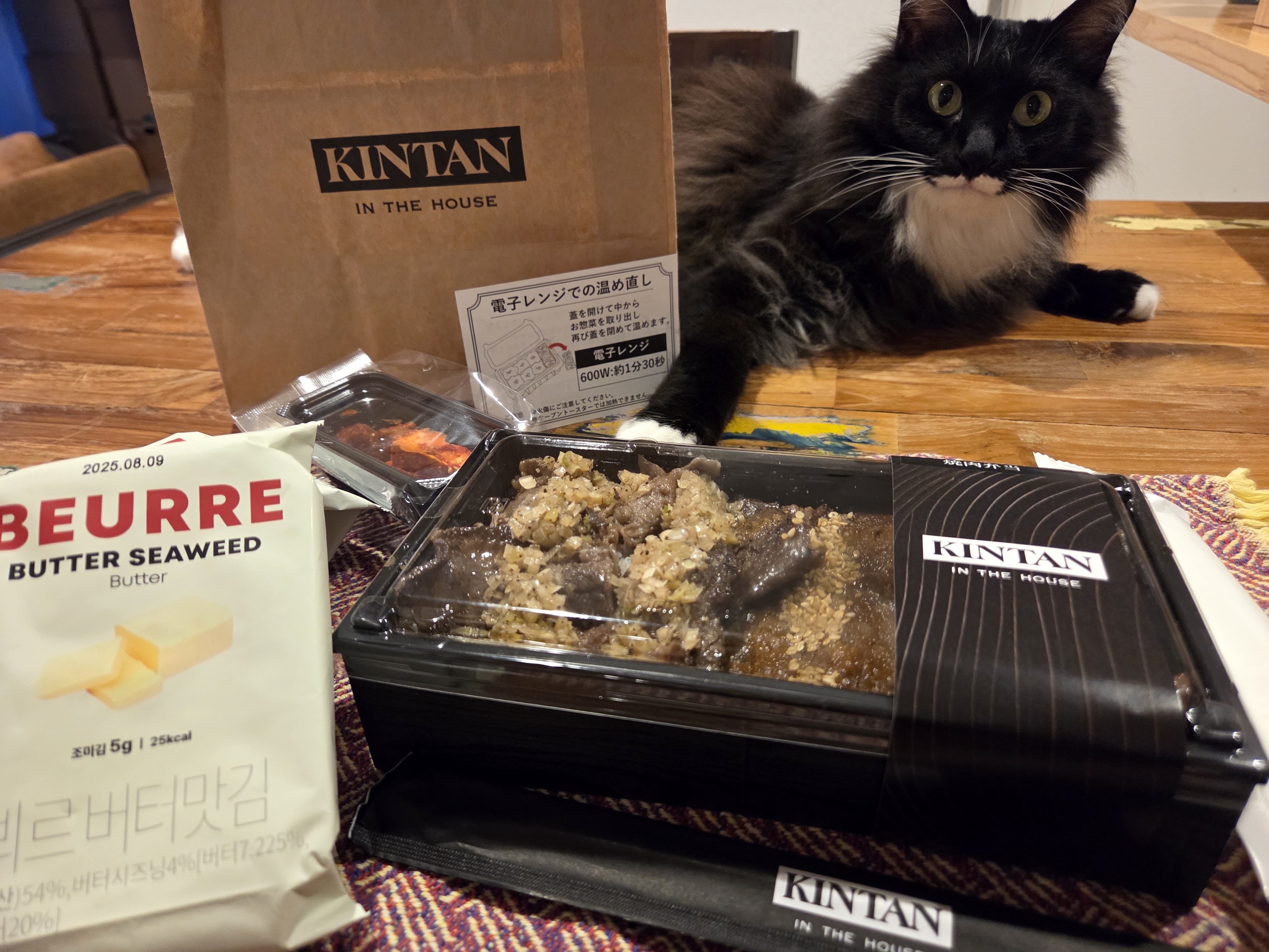 お家でまったり、猫と一緒に贅沢KINTANの焼肉弁当を楽しみます😃