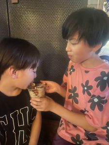 ラスト一個のフローズンチョコバナナを分けっこするかわいい二人👦