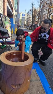 お子様には毎年恒例のくじ引きや、はっぴを着ての餅つき体験も🎶