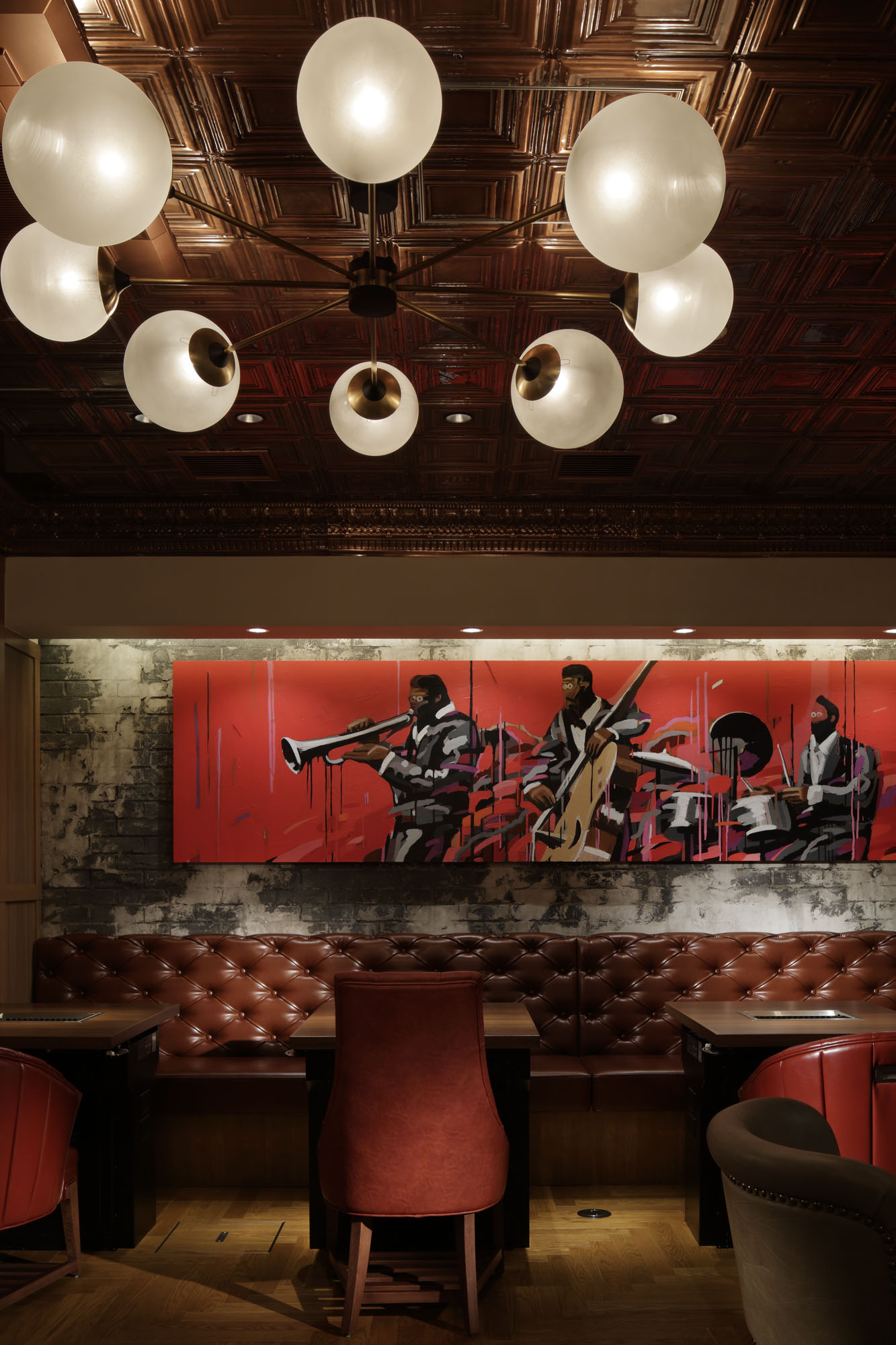 そして、この空間を完成させる最後のピースが「アート」だった。ペインターのMasashi Ozawaさんに、俺が好きな曲とイメージを伝えて描いてもらった。 人生の一曲を選べと言われたら、俺はStingの『Englishman in New York』を挙げる。恵比寿焼肉kintanの頃から、ずっとプレイリストに入っている一曲だ。曲中で繰り返される “Be yourself no matter what they say” というフレーズ。「人が何を言おうと、自分らしくあれ」。それは俺の人生の指針そのものだ。曲が転調する後半、サックス奏者Branford Marsalis(ブランフォード・マルサリス)のソロパートがある。初めて聴いた瞬間、彼の都会的でありながら物憂げなサックスの音色に取り憑かれてしまった。デヴィッド・フィンチャーが撮影したPVの退廃的なニューヨークの空気感と、あの音が完璧にフィットしていた。抑圧されたクールさ。たまらなくカッコいい。このイメージを描いて欲しいとお願いした。不思議なもので、店が閉店してもアートは一生残る。どこかの店舗か、あるいは俺たちのオフィスに飾ろうと思う。本物の想いは、こうして形を変えて残っていくんだね。