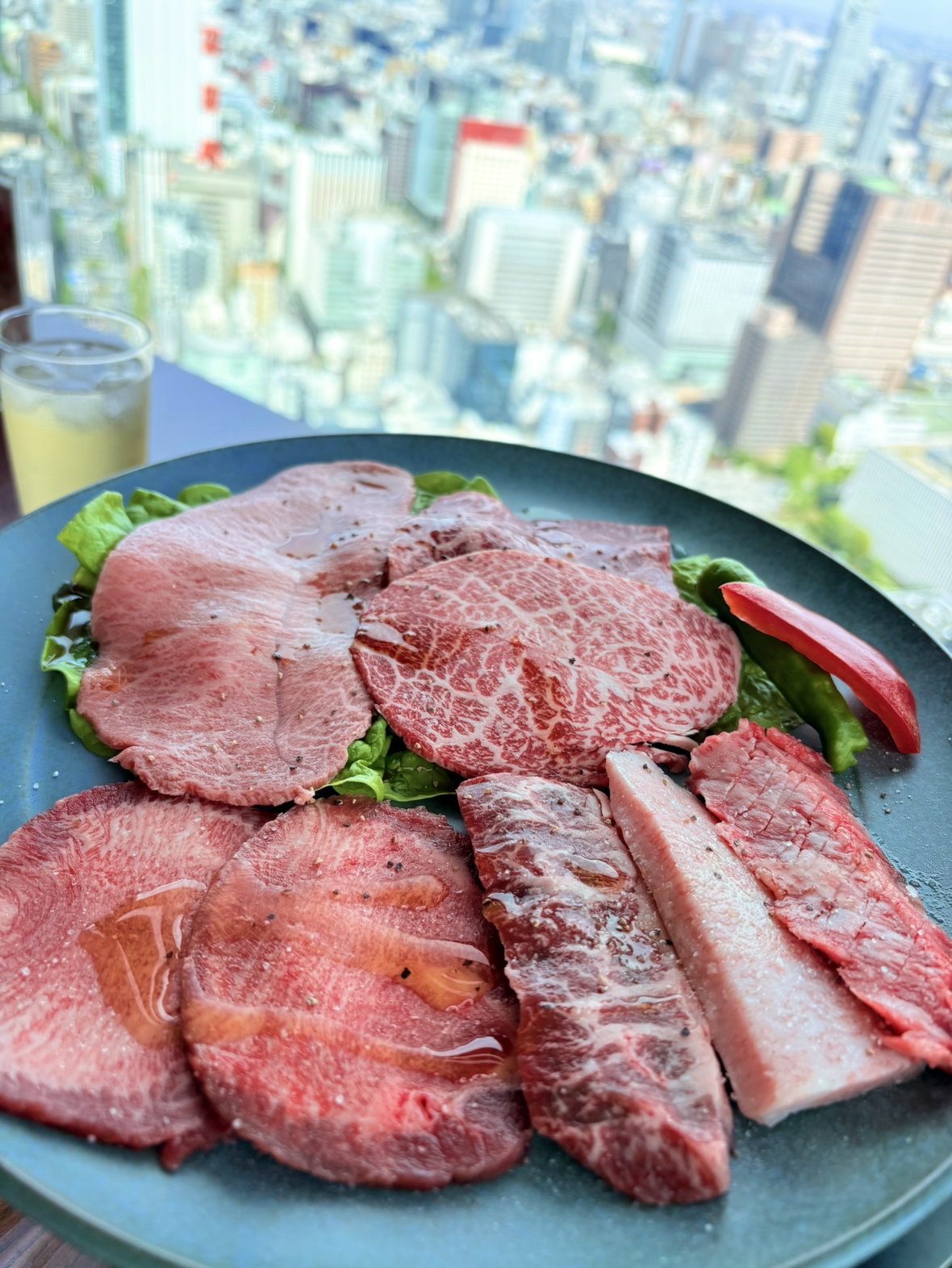 こちらがお肉の盛り合わせ!(地上215mからの景色とご一緒にどうぞ)