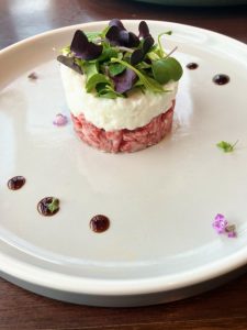 フレンチみたいなキレイな盛り付け!黒毛和牛のサーロインのユッケに、新玉ねぎで作ったタルタルソースがたっぷり。新玉ねぎの優しい甘味が口の中に広がります💗